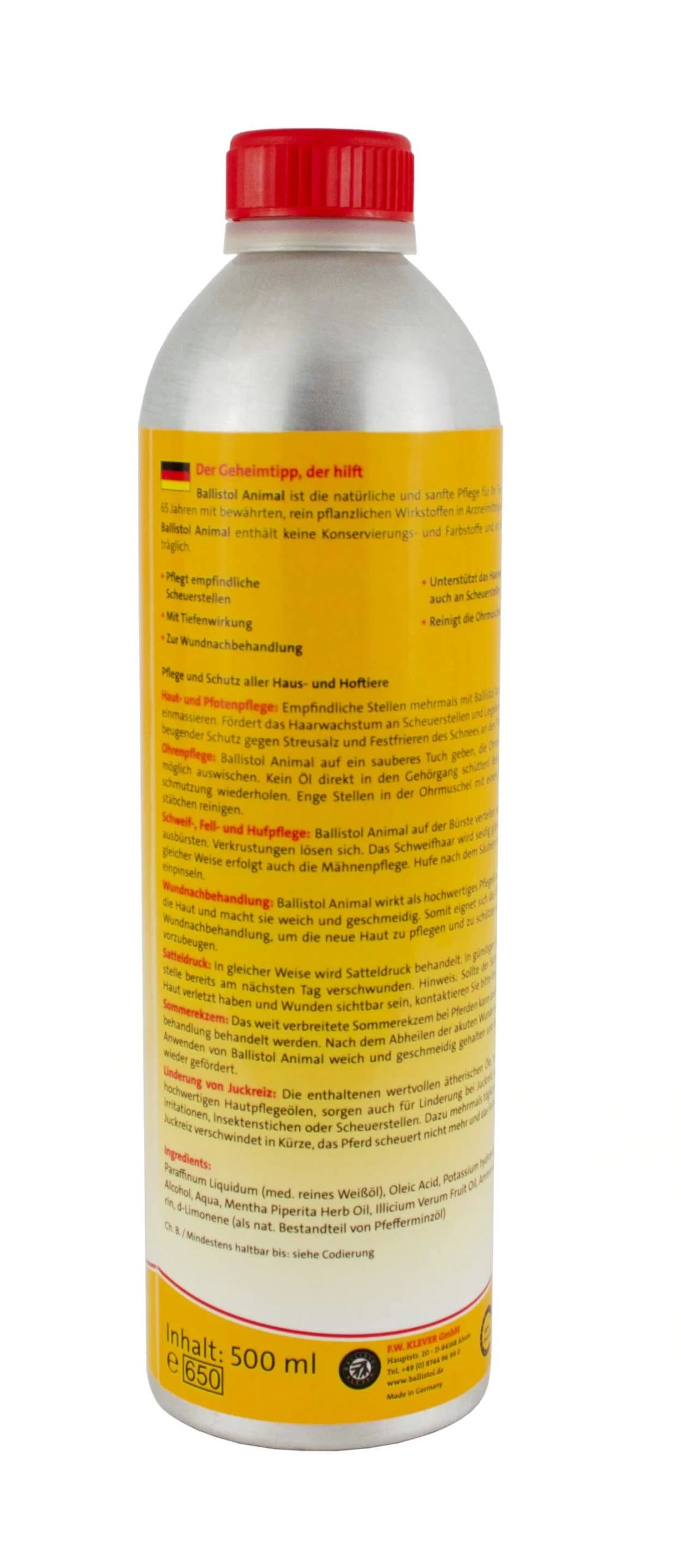 Ballistol Animal ist als Öl perfekt zur Wundnachbehandlung (z.B. bei Sommerekzem), zur Behandlung von Druckstellen, zur Linderung von Juckreiz und wirkt ebenfalls durch seine keimfreiheit desinfizierend