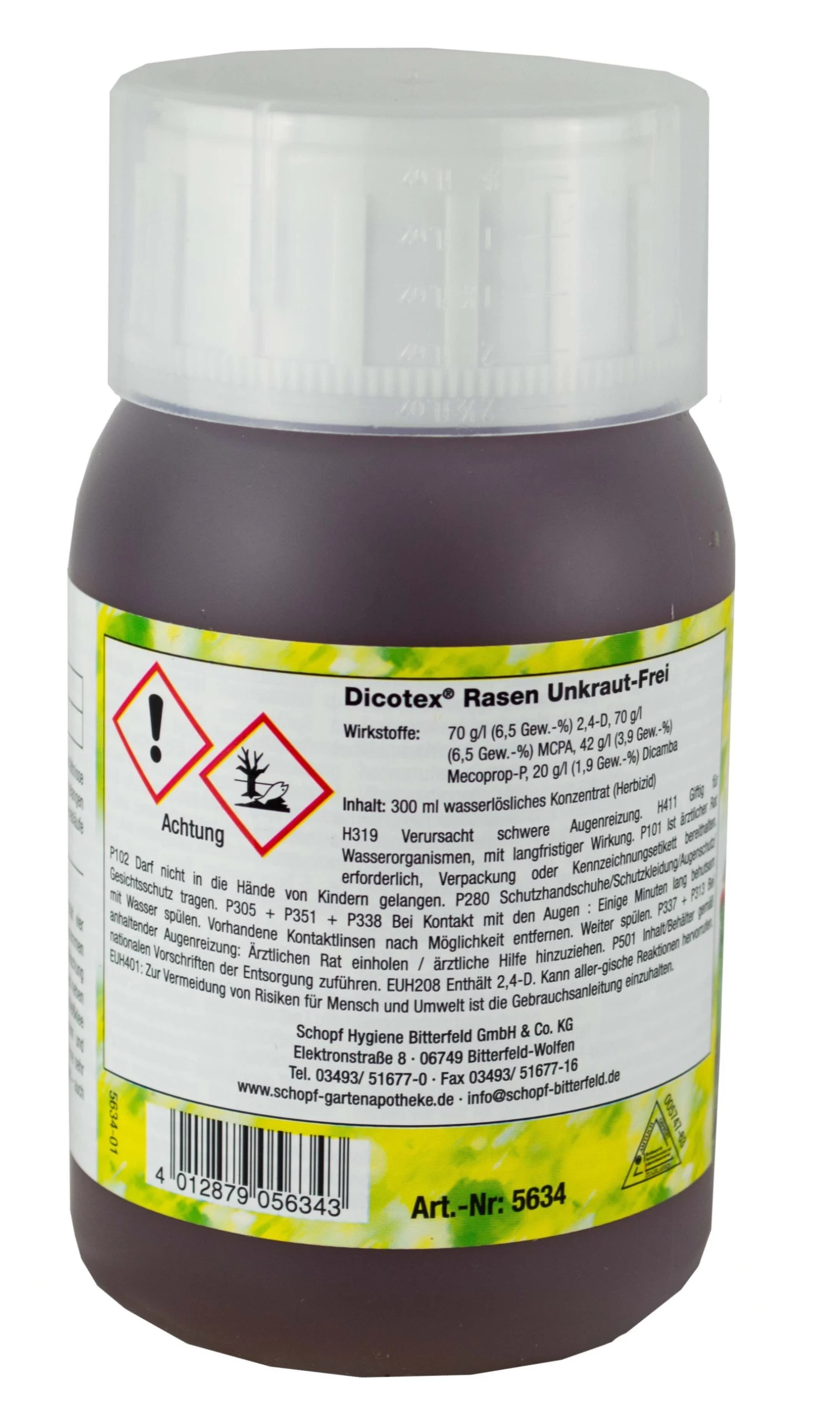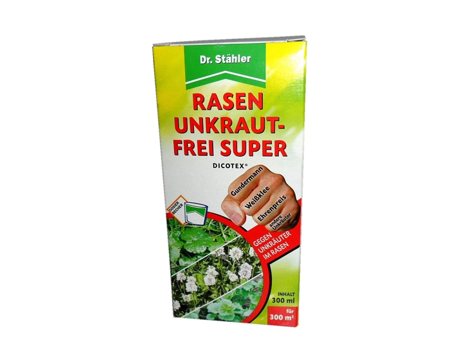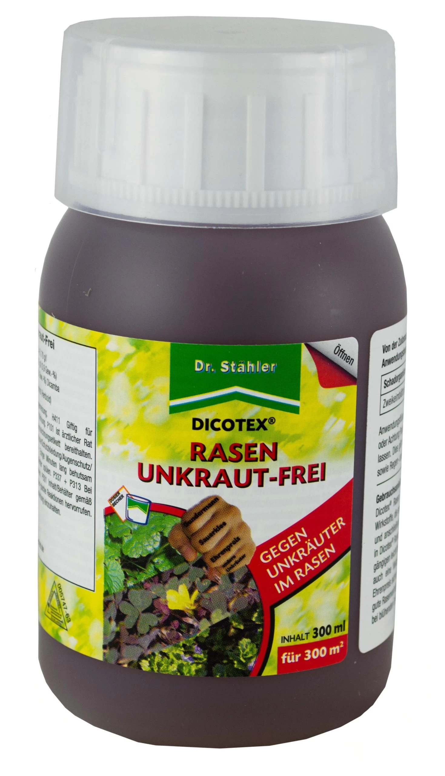 von Dr. Stähler ist ein selektives Herbizid auf Rasenflächen mit vier Wirkstoffen, die sowohl über das Blatt als auch über die Wurzeln der Unkräuter aufgenommen und anschließend in der ganzen Pflanze verteilt werden. Die 4-fach Mischung sorgt für ein sehr breites Wirkungsspektrum, so dass neben gängigen Unkräutern wie z.B. Löwenzahn, Gänseblümchen und Weißklee auch eine Vielzahl Problemunkräuter wie z.B. Gundermann und Ehrenpreis sicher bekämpft werden. Gleichzeitig besitzt Rasen Unkraut-Frei Super Dicotex eine sehr gute Rasenverträglichkeit, ist nicht bienengefährlich und kann daher uneingeschränkt – auch bei blühenden Unkräutern – eingesetzt werden.