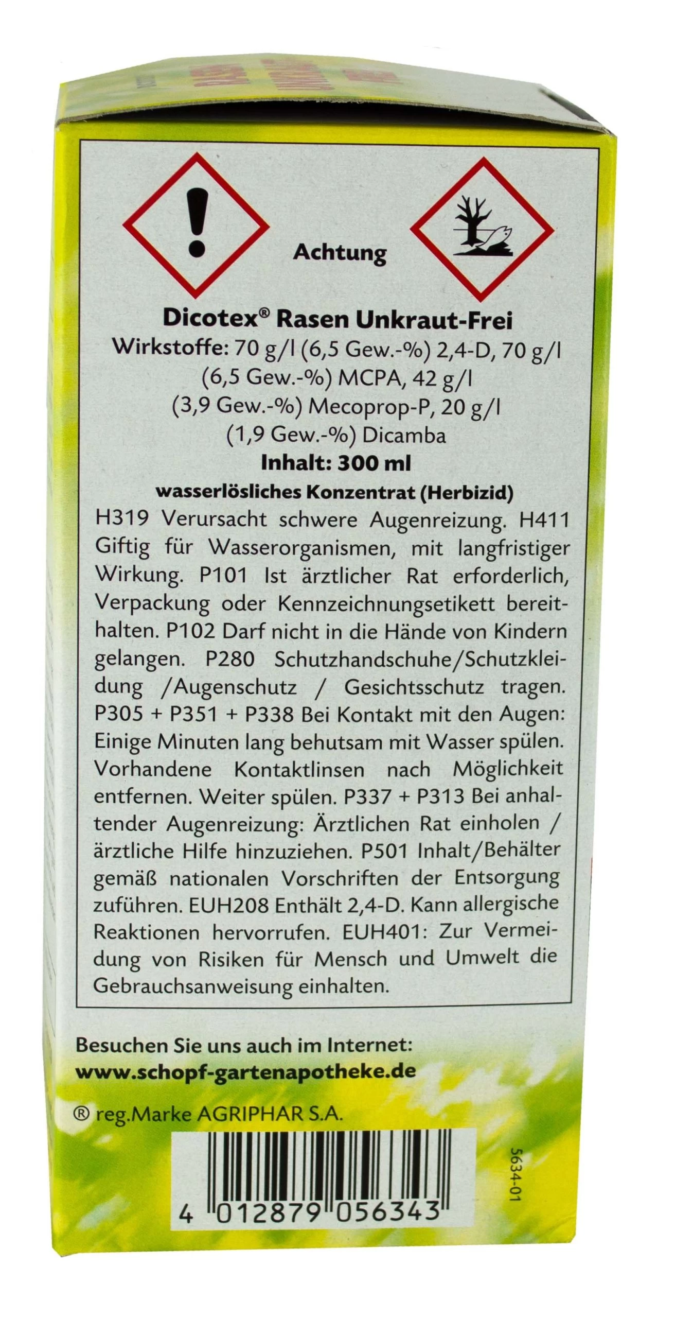 Jeden unnötigen Kontakt mit dem Mittel vermeiden. Missbrauch kann zu Gesundheitsschäden führen (SB001). Die Richtlinie für die Anforderungen an die persönliche Schutzausrüstung im Pflanzenschutz „Persönliche Schutzausrüstung beim Umgang mit Pflanzenschutzmitteln“ des Bundesamtes für Verbraucherschutz und Lebensmittelsicherheit ist zu beachten (SB110). Dicht abschließende Schutzbrille tragen beim Umgang mit dem unverdünnten Mittel (SE110). Bei Nachfolgearbeiten in frisch behandelten Pflanzen sind Arbeitskleidung (mindestens langärmliges Hemd und lange Hose) und Handschuhe zu tragen (SF190). Nutzung behandelter Rasenfläche als Spiel- und Liegewiese erst nach dem nächsten Schnitt (SF243). Universal-Schutzhandschuhe (Pflanzenschutz) tragen beim Umgang mit dem unverdünnten Mittel (SS110). Schutzanzug gegen Pflanzenschutzmittel und festes Schuhwerk (z.B. Gummistiefel) tragen beim Umgang mit dem unverdünnten Mittel (SS2101). Gummischürze tragen beim Umgang mit dem unverdünnten Mittel (SS610). Kennzeichnung GefStoffV R 43: Sensibilisierung durch Hautkontakt möglich. R 51/53: Giftig für Wasserorganismen, kann in Gewässern längerfristig schädliche Wirkungen haben. S 2: Darf nicht in die Hände von Kindern gelangen. S 13: Von Nahrungsmitteln, Getränken und Futtermitteln fernhalten. S 23: Dampf/Aerosol nicht einatmen. S 24: Berührung mit der Haut vermeiden. S 35: Abfälle und Behälter müssen in gesicherter Weise beseitigt werden. S 36/37: Bei der Arbeit geeignete Schutzkleidung und Schutzhandschuhe tragen. S 46: Bei Verschlucken sofort ärztlichen Rat einholen und Verpackung oder Etikett vorzeigen. S 51: Nur in gut belüfteten Bereichen verwenden. S 57: Zur Vermeidung einer Kontamination der Umwelt geeigneten Behälter verwenden. Enthält 2,4-D. Kann allergische Reaktionen hervorrufen. Zur Vermeidung von Risiken für Mensch und Umwelt ist die Gebrauchsanleitung einzuhalten. – SP001 Verpackung darf nicht wieder verwendet werden.