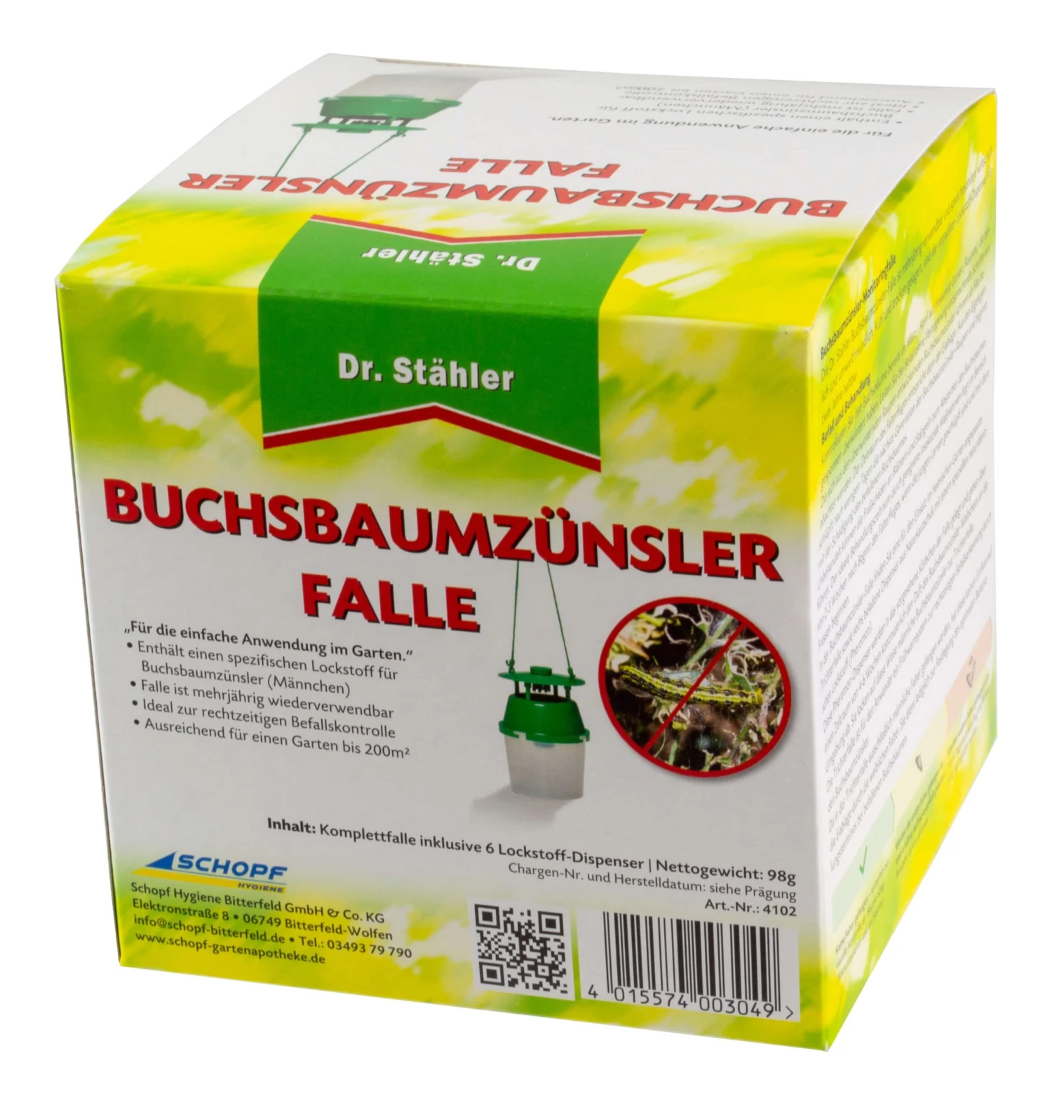 Diese Buchsbaumzünslerfalle von Dr. Stähler gibt Ihnen die nötigen Signale um Buchsbaumzünsler rechtzeitig zu entfernen. Sie können diese Montoringfalle mehrjährig nutzen, damit Sie jederzeit die Kontrolle über Ihre Buchsbäume haben. Der spezielle Lockstoff zieht nur männliche Falter an, dies hat keinen Einfluss auf die Eiablage durch die weiblichen Falter. Sie dient lediglich zur Festlegung des optimalen Behandlungstermin bei befallenen Buchsbäumen.