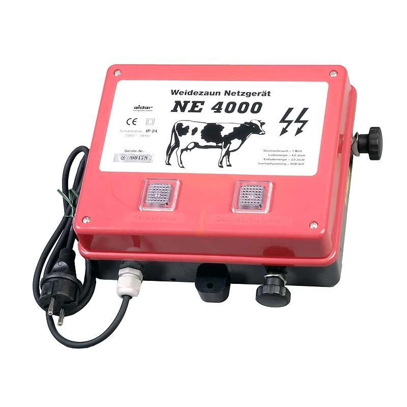 Das NE 4000 Weidezaun Netzgerät von Eider ist für alle Tierarten und für normale Zaunanlagen mit mittlerem Bewuchs geeignet. Das Gerät hat integrierte Kontrolleuchten für die Netz- und Zaunhauptkontrolle und ist sowohl spritzwassergeschützt als auch besuchsvernichtend. Zusätzlich ist es für die Wandmontage geeignet. Das Produkt wird in Deutschland hergestellt.
