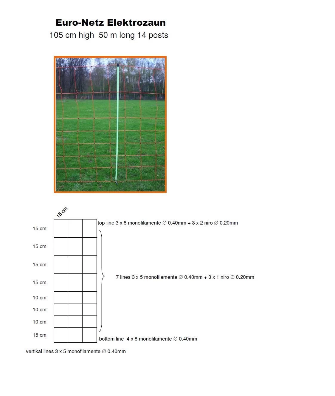 Das Euro-Netz mit EInzelspitzen von Euronetz hat eine Gesamtlänge von 50m und ist 106cm hoch. Jeder Maschenkreuzungspunkt des Netzes ist mit Kunststoffplomben unlösbar verschweißt und bietet so eine hohe Haltbarkeit. Das Netz wird inklusive 8 horizontalen Kunststofflitzen geliefert, wovon 7 einen eingearbeitetetn Chromnickeldraht enthalten. Ebenfalls im Lieferumfang enthalten sind 14 Pfähle mit Einzelspitzen.