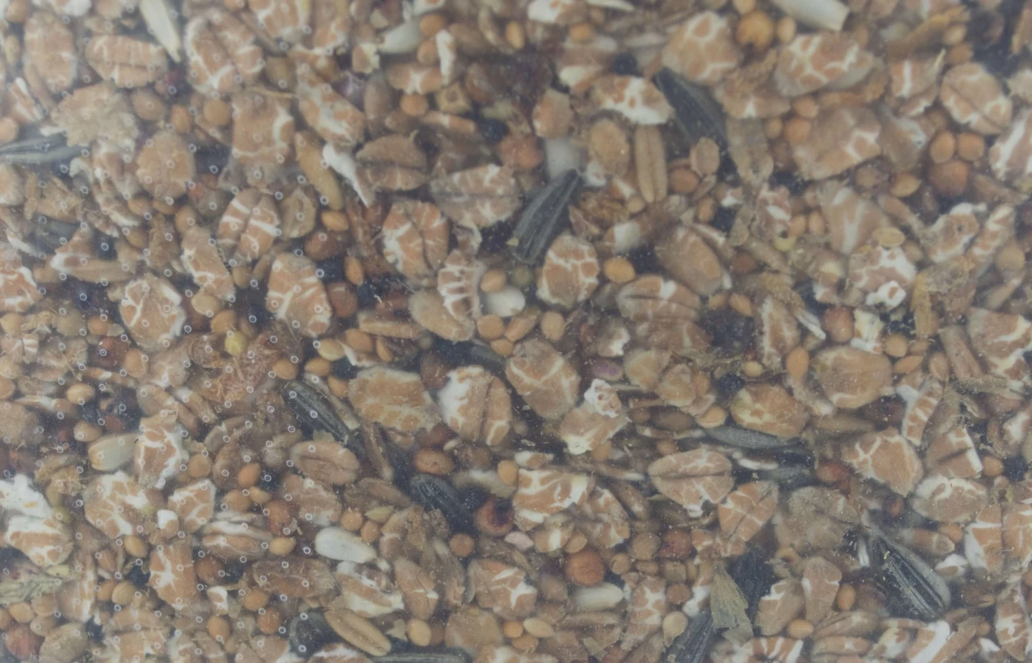 Es besteht aus verschiedensten Komponenten, wie Erdnüsse, eiweißreiche Hirse, Weizenflocken, Wildsamen, Raps, proteinreiche Garnelen, Rosinen, Datteln und Buchweizen.