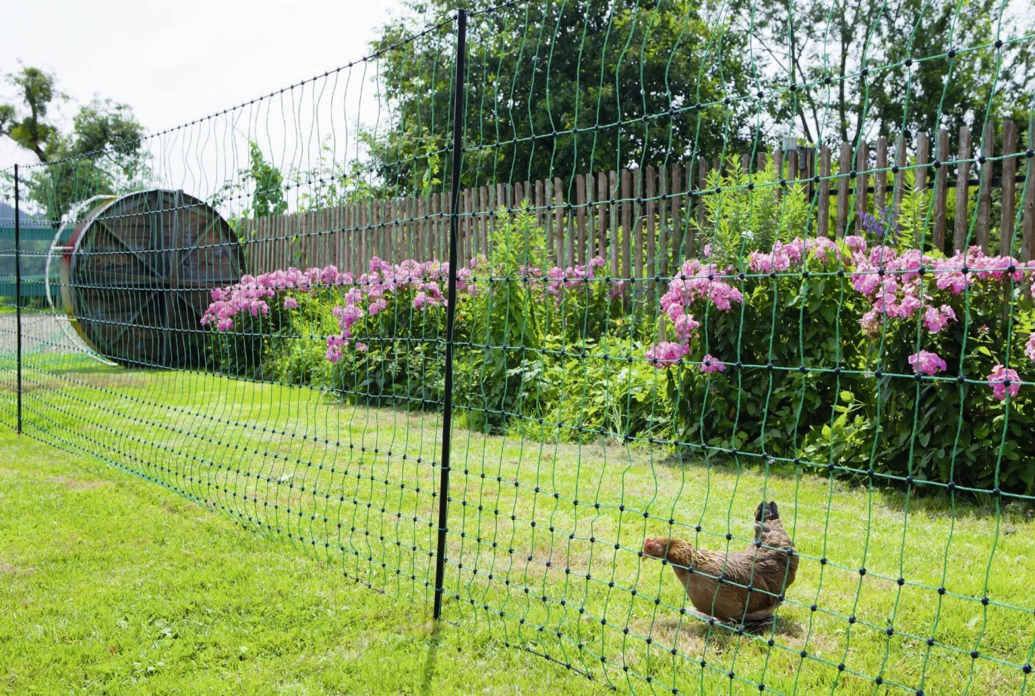Das Geflügelnetz in grün von Euronetz ist 25 m breit und 1,12 m hoch. Es hat eine besonders geringe Maschenweite im unteren Bereich des Netzes, wodurch es sehr gut für kleinere Tiere geeignet ist. Dabei schützt es nicht nur ihre Tiere vor dem Ausbruch, sondern hält auch Wildtiere fern, die hier nichts zu suchen haben. Standfeste, gut sichtbare Kunststoffpfähle sichern das Netz. Das Netz ist elektrifizierbar. Weiteres Zubehör für Ihren Elektrozaun finden Sie hier bei uns im Shop.