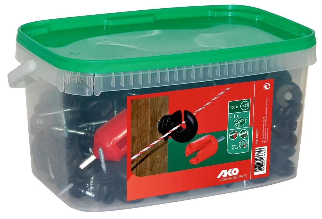 Die Ringisolatoren von Kerbl werden inklusive Einschraubet im praktischen Eimer mit je 100 Stück in schwarz geliefert. Die Isolatoren zeichnen sich durch ihre breite Drahtauflage aus und der durchgehend verzinkten 5,3 mm Stütze.