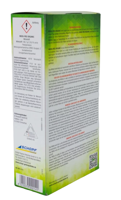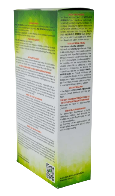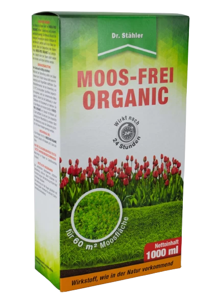 Moos- Frei ORGANIC wirkt gegen viele verschiedene Moosarten im Rasen. Die Wirkung ist bereits nach einem Tag sichtbar. Behandelte Moose verfärben sich gelbbraun. Moos- Frei ORGANIC hinterlässt auf versehentlich getroffene Verbundsteine, Basalt und Waschbeton keine rostbraunen Flecke. Moos – Frei ORGANIC ist gut pflanzenverträglich. In Einzelfällen kann es zu Verfärbungen der Gräserspitzen kommen, die sich jedoch nach kurzer Zeit wieder erholen. Mittel nicht auf Blätter der angrenzenden Gartenpflanzen gelangen lassen.