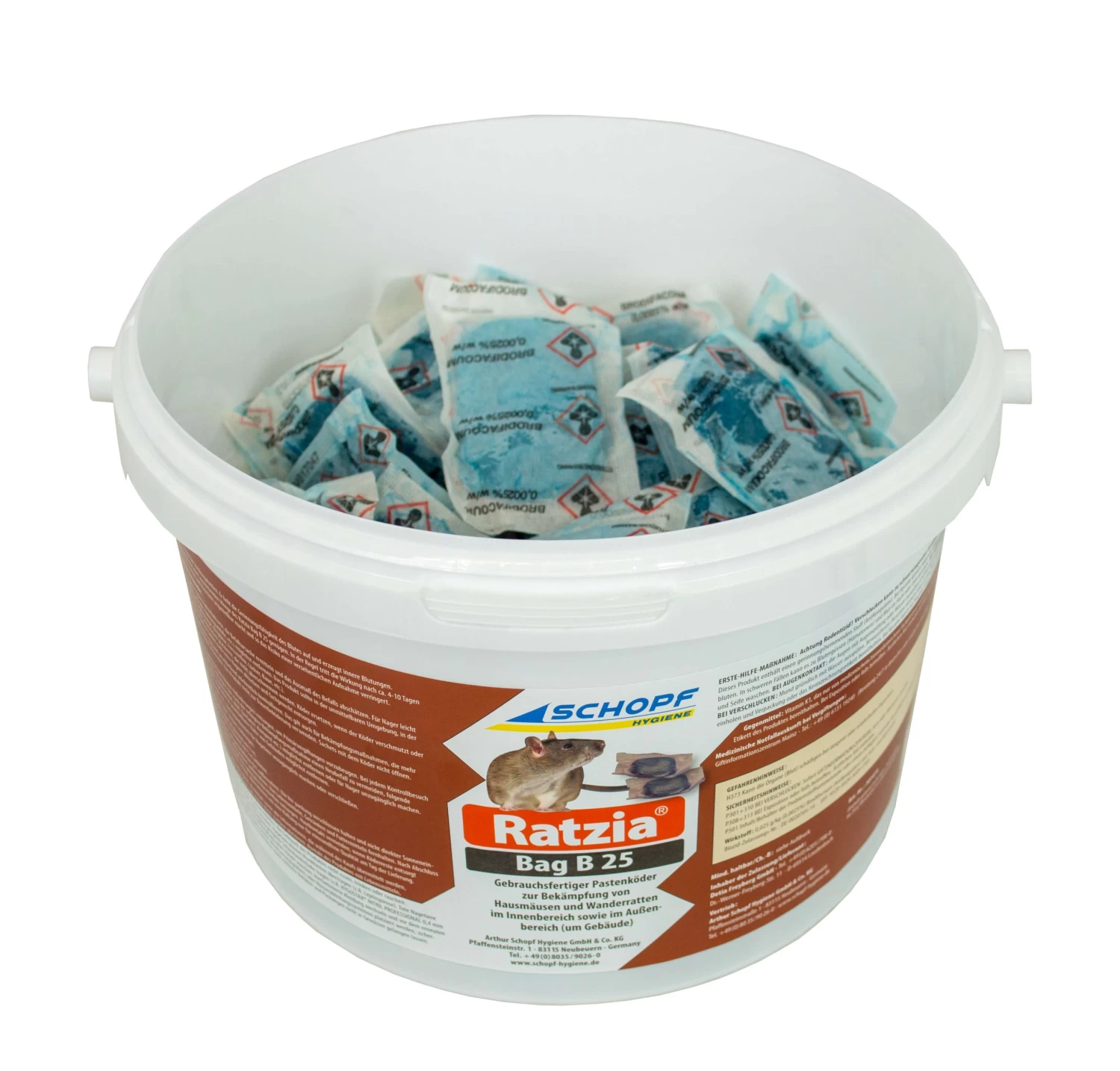 Ratzia Bag B25 ist eine freiverkäufliche Giftpaste , zur Anwendung gegen Ratten und Mäuse. Die Wirkung tritt nach 4 – 10 Tagen schlagartig ein, die verzögerte Wirkung ist notwendig, damit die Artgenossen nicht misstrauisch werden. Bitterstoffe machen das Rattengift ungenießbar für Menschen und Haustiere. Jedoch empfehlen wir die Ausbringung in Köderstationen, damit der Köder vor Kinder und Nicht-Zieltieren geschützt ist.