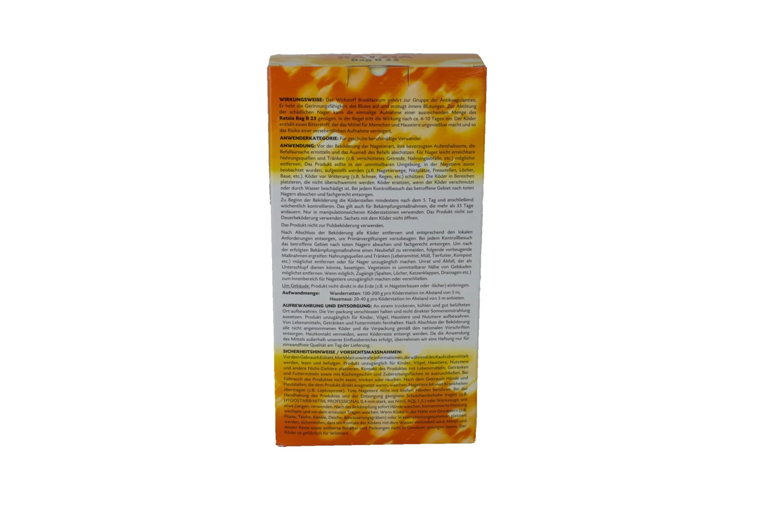 Ratzia Bag B25 ist eine freiverkäufliche Giftpaste , zur Anwendung gegen Ratten und Mäuse. Die Wirkung tritt nach 4 – 10 Tagen schlagartig ein, die verzögerte Wirkung ist notwendig, damit die Artgenossen nicht misstrauisch werden. Bitterstoffe machen das Rattengift ungenießbar für Menschen und Haustiere. Jedoch empfehlen wir die Ausbringung in Köderstationen, damit der Köder vor Kinder und Nicht-Zieltieren geschützt ist.