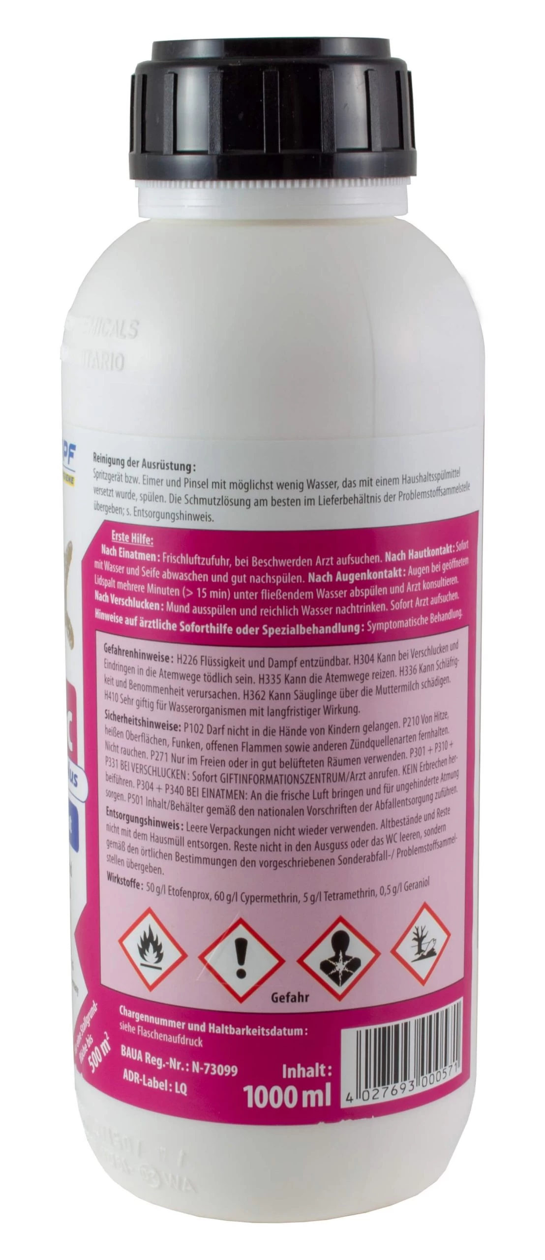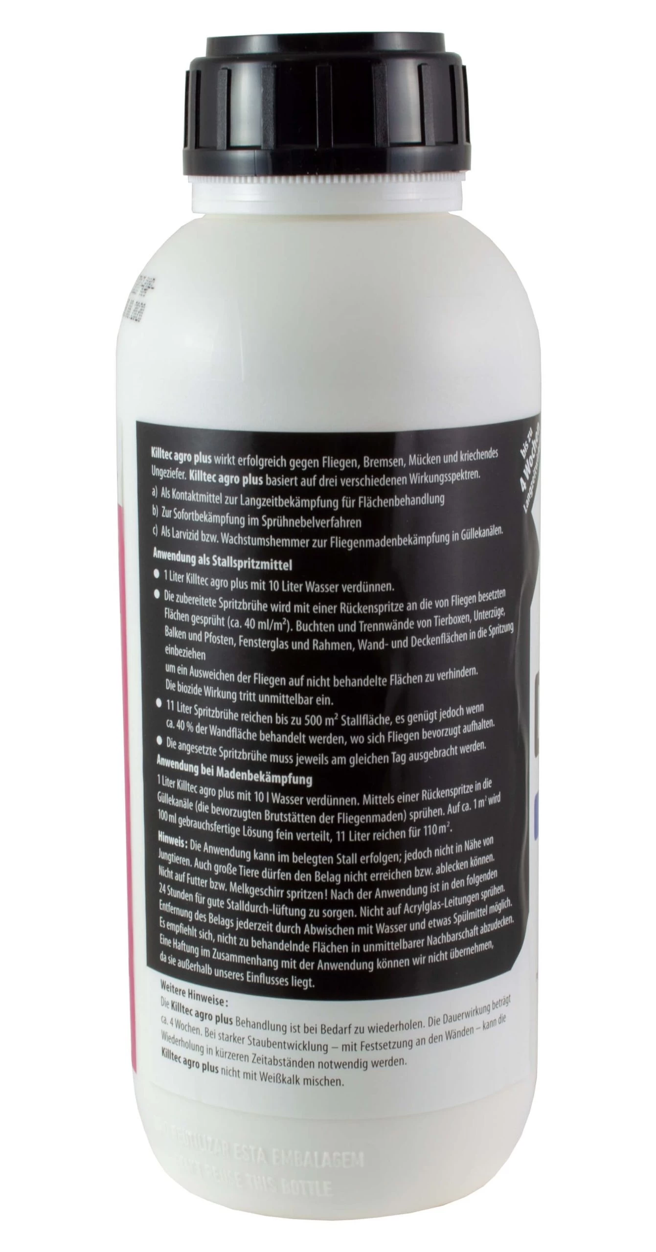Killtec Agro Plus ist ein Spitzmittel das für den Gebrauch in landwirtschaftlichen Bereichen Verwendung findet. Das Spritzkonzentrat bekämpft mühelos Stallfliegen und Fliegenmaden. Besonders hartnäckiges fliegendes Ungeziefer wie z.B. Fliegenlarven und Rattenschwanzlarven werden effektiv bekämpft. Fliegen sind Überträger diverser Infektionskranktheiten die zum Teil schwerwiegende Auswirkungen haben können wie z.B. Ruhr, Typhus, Cholera, Salmonellosen, Maul- und Klauensucht. Das Spritzmittel wirkt sofort und effektiv in Stallflächen bis 500 m²