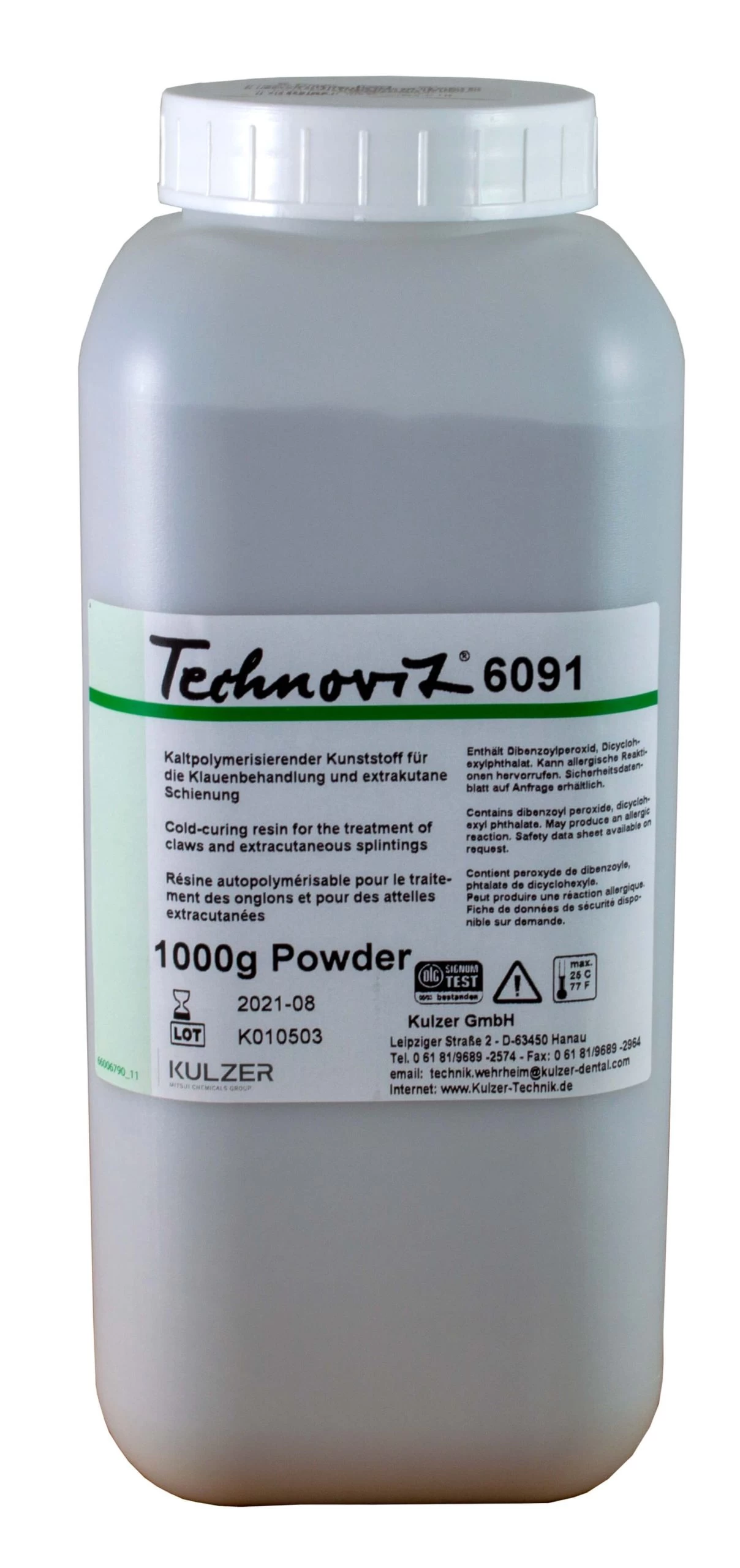 Der schnellhärtende Kunststoff Technovit 6091 ist durch seine besonderen Eigenschaften ein unentbehrliches Universalhilfsmittel in der Veterinärmedizin und in der Klauenpflege und Klauenbehandlung. In bestimmten Indikationsbereichen unterstützt Technovit 6091 die Therapie des Tierarztes und verkürzt die sonst oft langen Behandlungszeiten wesentlich. In der Klauen- und Hufbehandlung ergeben sich für Technovit 6091 vor allem folgende Anwendungsbereiche: Ruhigstellung von Klauen bei entzündlichen Erkrankungen, Fixierung von Klauenspitzen, Abdeckung von Hufdefekten, Hornspalten, Formgebung des Hufes, orthopädische Hufbehandlung, besonders bei Fohlen (Bockhuf, Stelzfuß).