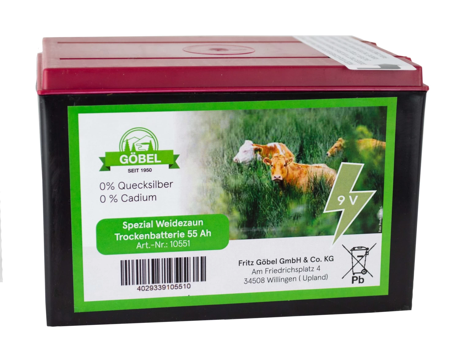 Die Weidezaun Trockenbatterie von Göbel hat eine Betriebsspannung von 9 Volt und eine Leistung von 55 Ah. Die Trockenbatterie besteht aus Zink und Kohle und ist damit umweltfreundlich, da sie frei von Quecksilber und Kadmium ist. Die Entsorgungskosten sind im Verkaufspreis enthalten.